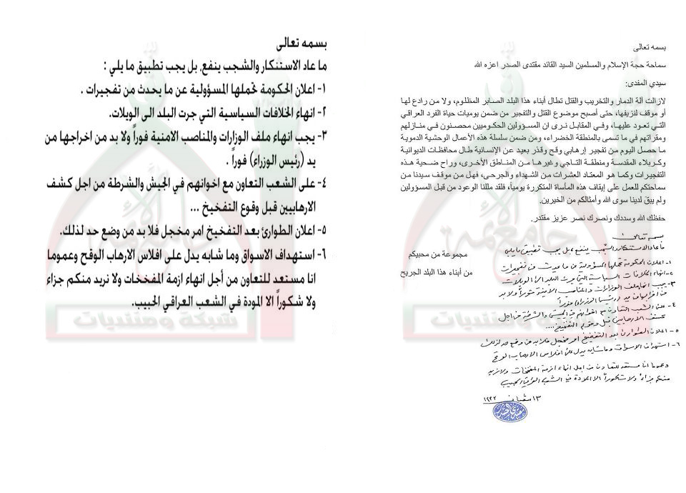 بعد التفجيرات الارهابية في الديوانية وكربلاء على الحكومة اعلان مسؤوليتها وانهاء ملف الوزارات الامنية واخراجها من يد ( رئيس الوزراء ) استفتاء السيد مقتدى الصدر اعزه الله 4 - 7 - 2012