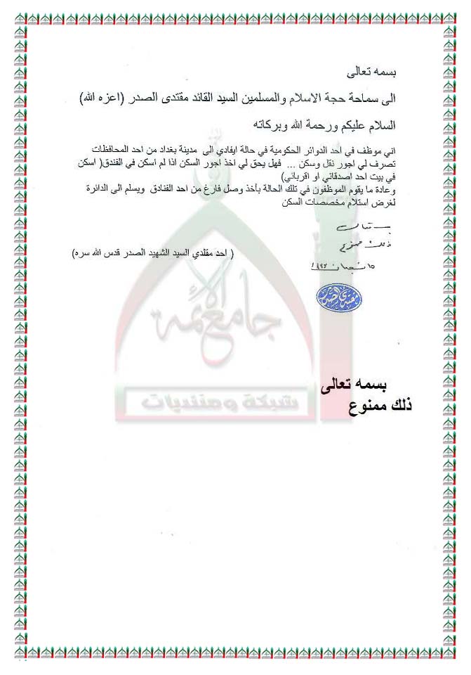 حكم اخذ الموظف للاموال من دوائر الحكومية كاجور نقل وسكن وعدم السكن بالفندق استفتاء السيد القائد مقتدى الصدر اعزه الله 7 - 7 - 2012