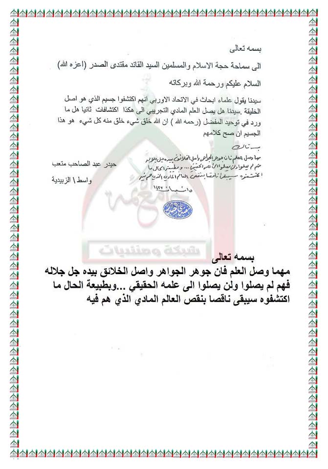 دعوى ما يتطارحه العلم الحديث من اكتشاف جسيم اصل الخليقة استفتاء السيد القائد مقتدى الصدر اعزه الله 7 - 7 - 2012