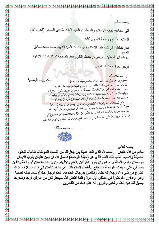 نصيحة الى طالبات كلية طب الاسنان استفتاء السيد القائد مقتدى الصدر اعزه الله 7 - 7 - 2012