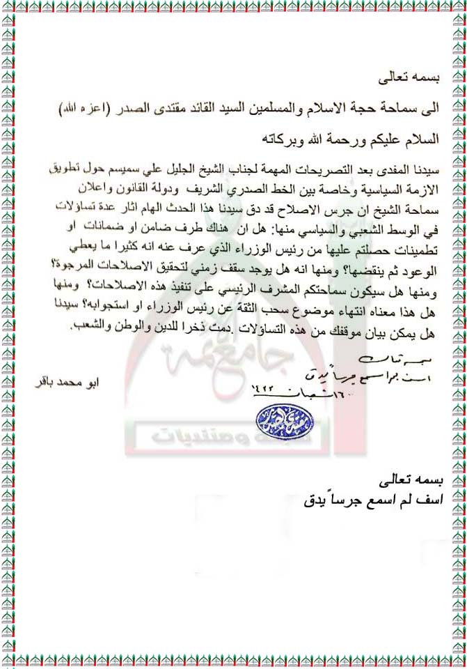 تصريحات الشيخ علي سميسم بخصوص الإصلاحات السياسية استفتاء السيد القائد مقتدى الصدر اعزه الله 7 - 7 - 2012