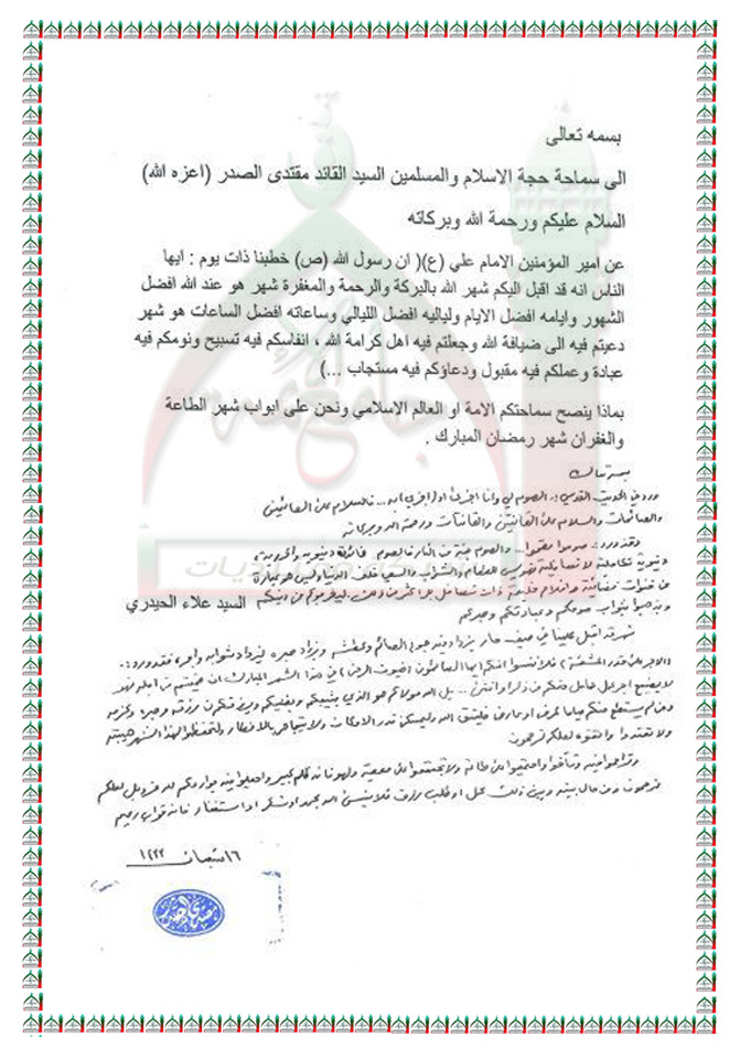 نصيحة لكل المسلمين الصائمين في شهر رمضان المبارك استفتاء السيد القائد مقتدى الصدر اعزه الله 8 - 7 - 2012