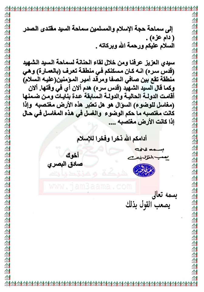 الارض المغتصبة استفتاء سماحة السيد القائد مقتدى الصدر ( اعزه الله ) 19 - 2 - 2011