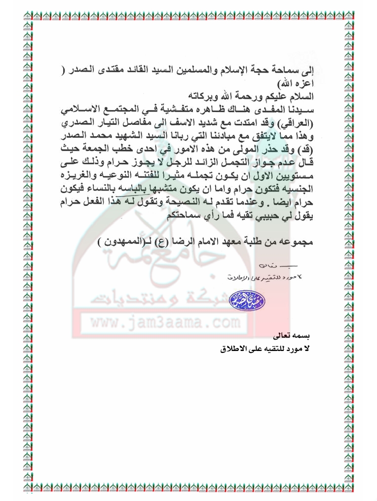 التجمل الزائد للرجال استفتاء سماحة السيد القائد مقتدى الصدر اعزه الله 30 - 10 - 2010