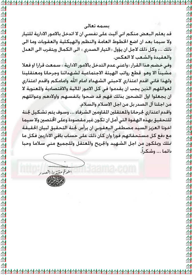بيان السيد القائد مقتدى الصدر اعزه الله حول تأخير رواتب الشهداء والجرحى والمعتقلين من ابناء الخط الصدري23 - 10 - 2012