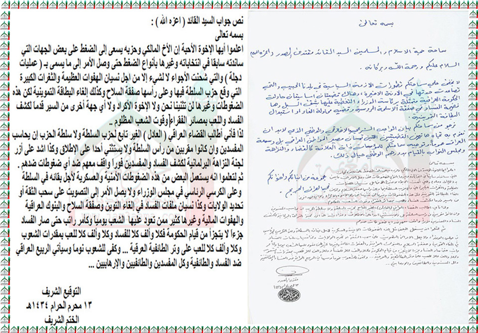 المالكي والتصرفات التي يقوم بها للتغطية على ملفات الفساد الكبيرة (ملف الاسلحة الروسية والغاء البطاقة التموينية) استفتاء السيد القائد مقتدى الصدر اعزه الله 27-11-2012