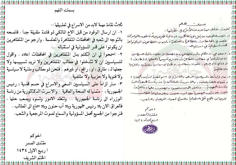 فـائدة إرسـال الوفود إلى المتظاهرين في عـدد من المحافظات وعدم تسييس المظاهرات بيان السيد القائد مقتدى الصدر اعزه الله 14 - 1 - 2013