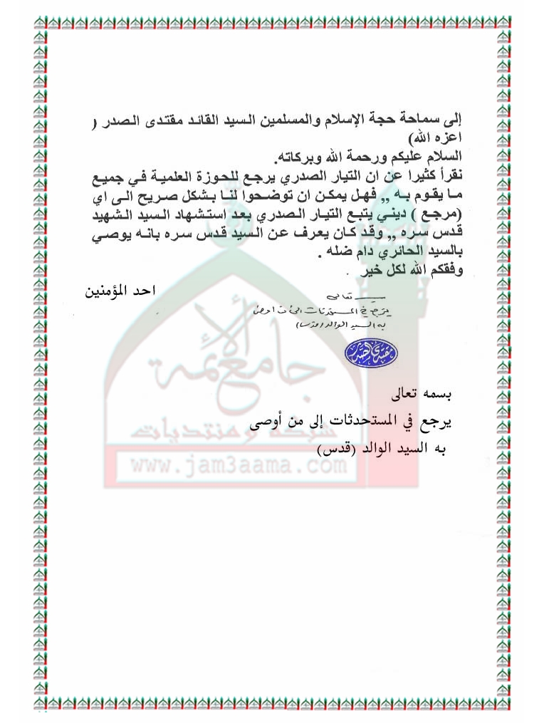 الى من برجع التيار الصدري استفتاء سماحة السيد القائد مقتدى الصدر اعزه الله 1 - 11 - 2010