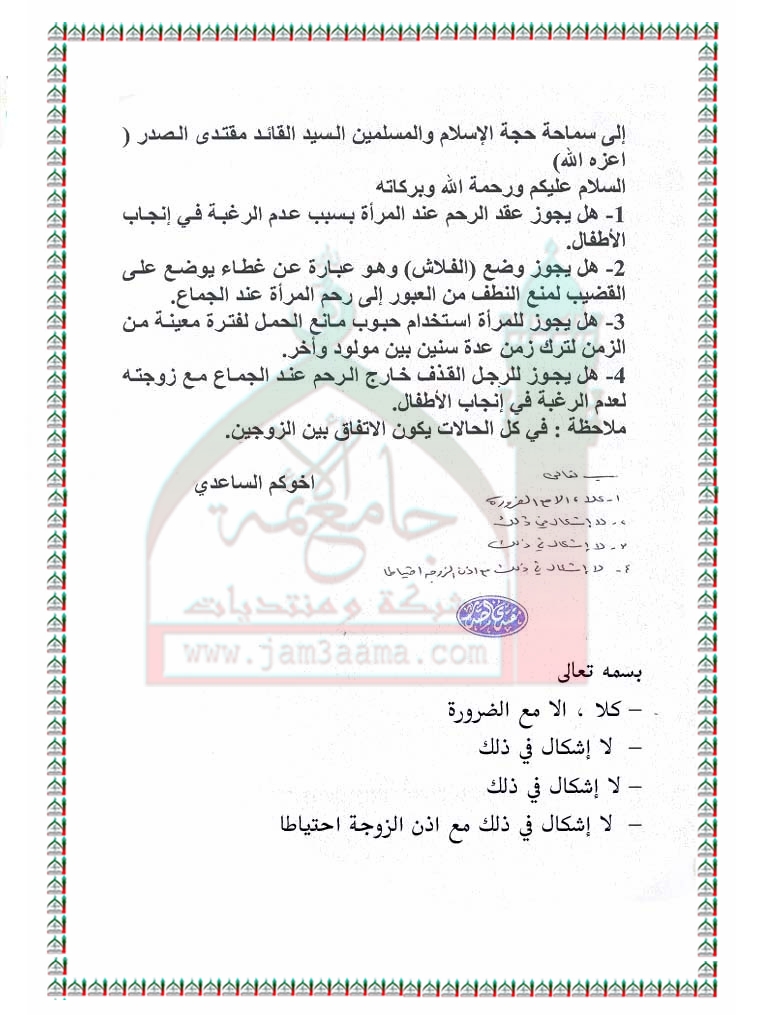 مشروعية بعض الطرق المستخدمة لتحديد الانجاب استفتاء سماحة السيد القائد مقتدى الصدر اعزه الله 1 - 11 - 2010