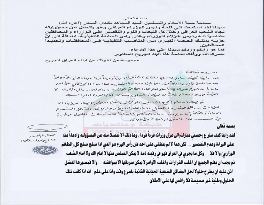 تنصل الحكومة عن مسئولياتها تجاه الشعب استفتاء السيد القائد مقتدى الصدر اعزه الله 28 - 2 - 2011