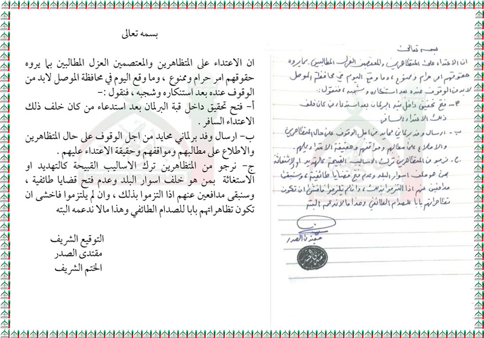 الاعتداء على المتظاهرين في محافظة الموصل بيان السيد القائد مقتدى الصدر اعزه الله 8 - 3 - 2013