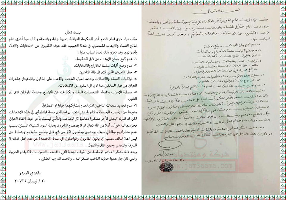 اخفاقات وسلبيات انتخابات مجالس المحافظات الاخيرة بيان السيد القائد مقتدى الصدر اعزه الله 20 - 4 - 2013-