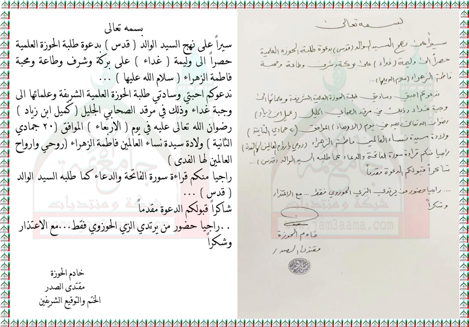 السيد القائد مقتدى الصدر اعزه الله يدعو طلبة العلم الى مأدبة غداء في مرقد الصحابي الجليل كميل بن زياد يوم الاربعاء الموافق (20 جمادي الثانية) ولادة سيدة نساء العالمين فاطمة الزهراء (عليها السلام) .
