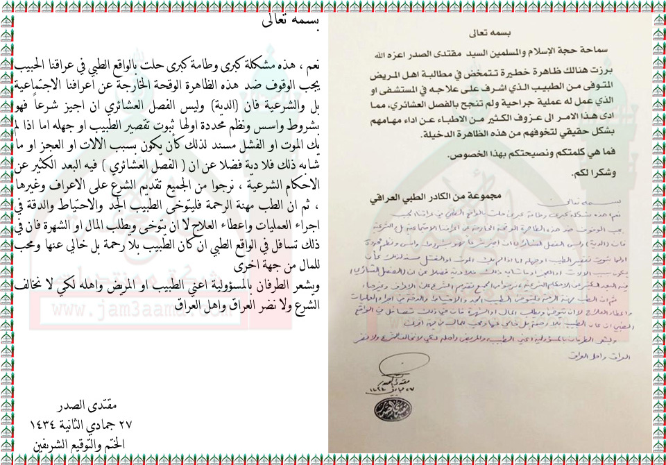 بعض الظواهر الدخيلة على مجتمعنا العراقي الحبيب من مطالبة اهالي المريض بما يسمى بالفصل العشائري استفتاء السيد القائد مقتدى الصدر اعزه الله 9 / 5 / 2013