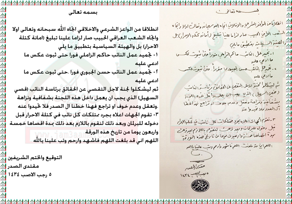 تجميد عمل النائبين حاكم الزاملي وحسن الجبوري بيان السيد القائد مقتدى الصدر اعزه الله 16 - 5 - 2013