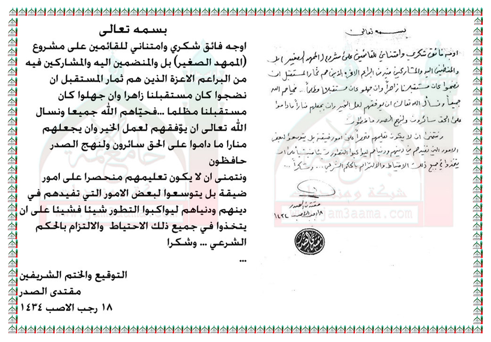 شكر الى القائمين والمنضمين الى مشروع "الممهد الصغير" بيان السيد القائد مقتدى الصدر اعزه الله 29 - 5 - 2013