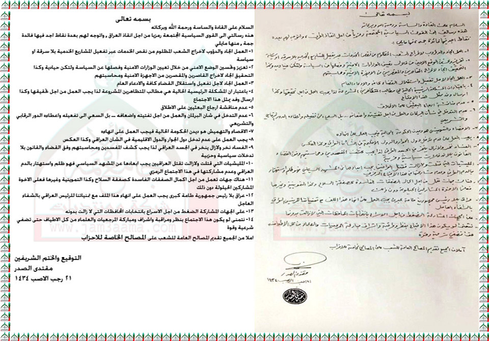 رسالة السيد القائد مقتدى الصدر اعزه الله الى القادة المجتمعين في منزل السيد عمار الحكيم1 / 6 /2013
