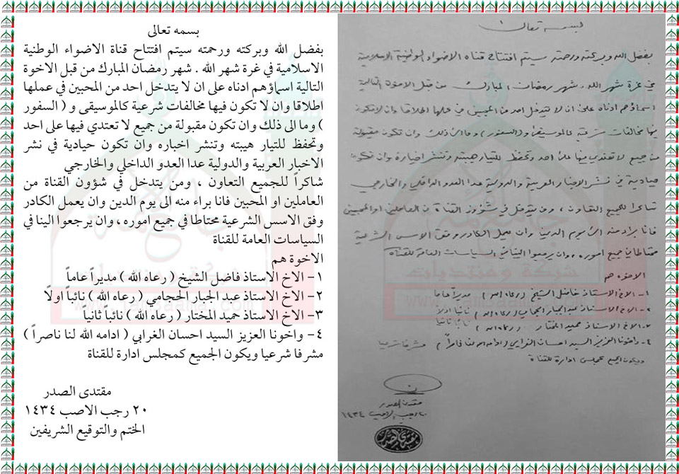 أفتتاح قناة الاضواء الوطنية الاسلامية في غرة شهر الله رمضان المبارك بيان السيد القائد مقتدى الصدر اعزه الله 2 - 6 - 2013
