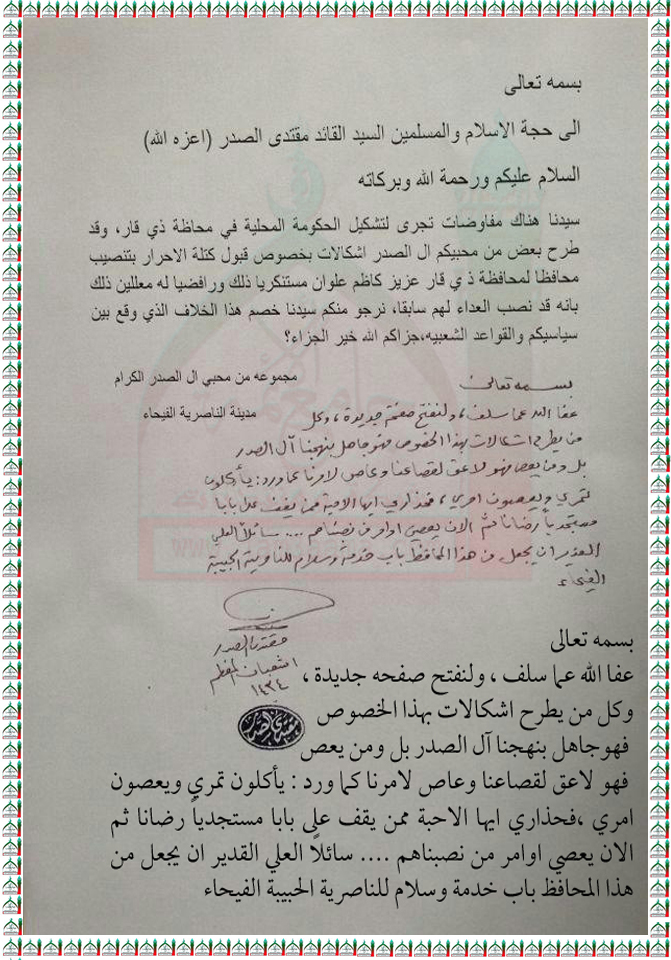 اشكالات كتلة الاحرار بخصوص اختيار محافظ الناصرية عزيز كاظم علوان استفتاء السيد القائد مقتدى الصدر اعزه الله 11 / 6 / 2013