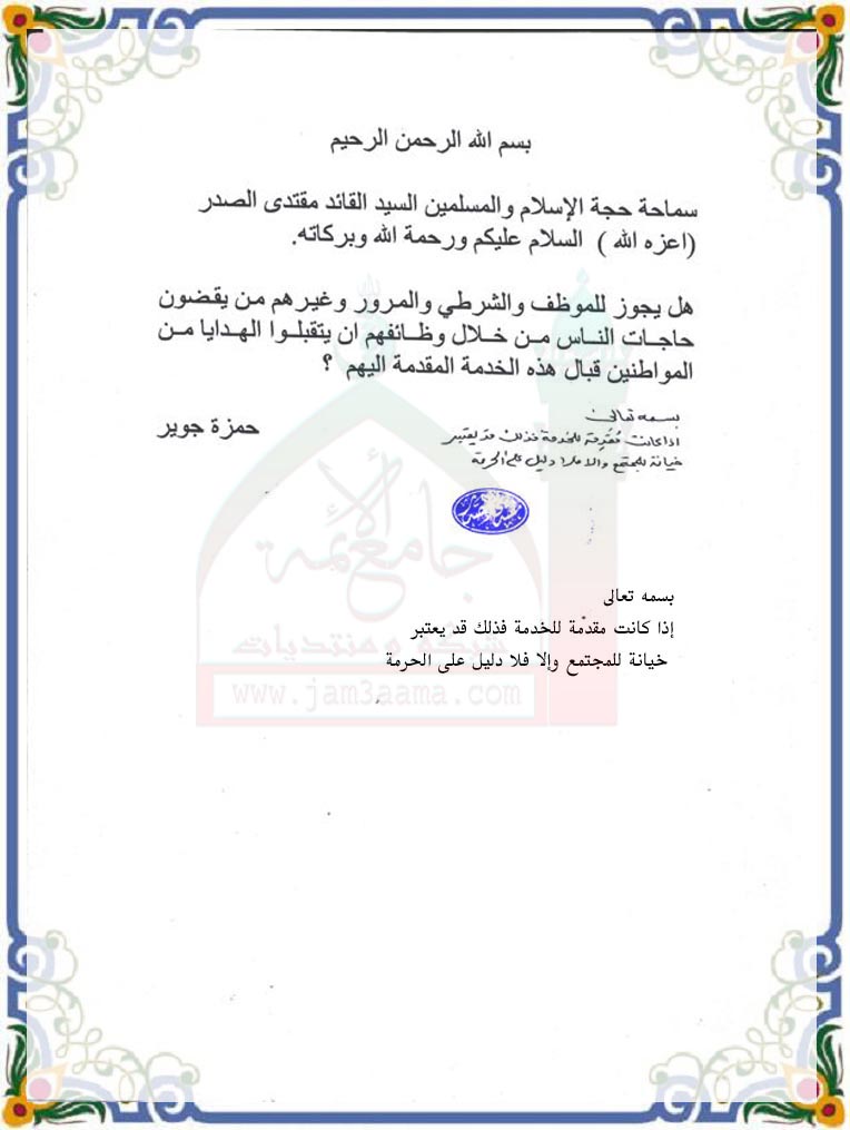تقديم الهدايا الى الموظفين(استفتاء للسيد القائد بتاريخ 4-3-2011)