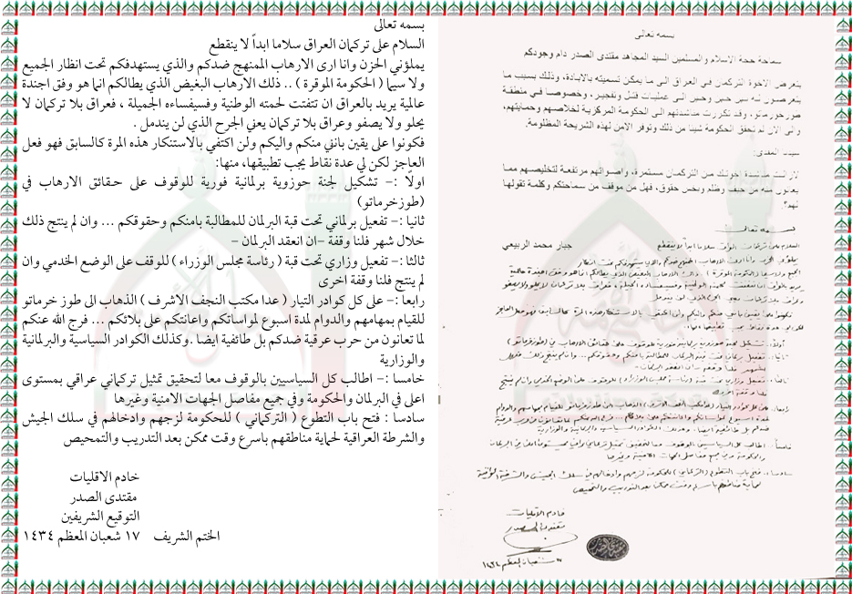 القتل والتهجير ومعاناة الاخوة التركمان والتفجيرات الاخيرة في قضاء طوز خورماتو استفتاء السيد القائد مقتدى الصدر اعزه الله 27 - 6 - 2013