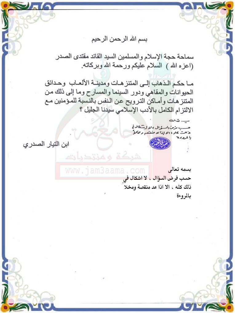الذهاب الى المتنزهات ودور السينما والمسارح(استفتاء للسيد القائد بتاريخ 4-3-2011)