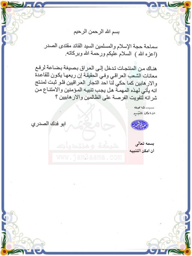بضائع يذهب ريعها للارهابيين(استفتاء للسيد القائد بتاريخ 4-3-2011)