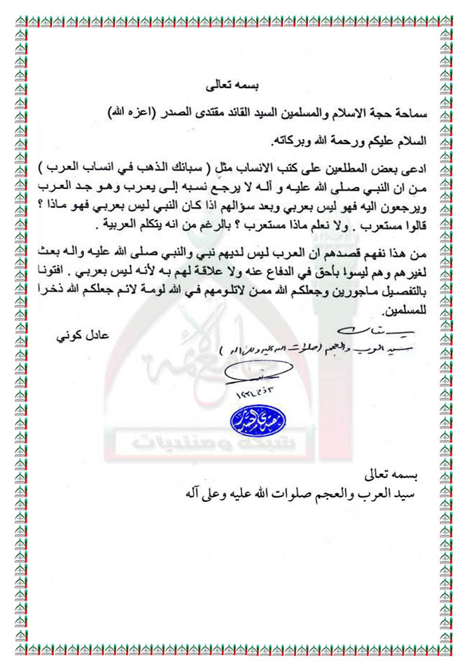 ادعاءات بعض المؤلفين ان النبي محمد صلى الله عليه وآله ليس عربي استفتاء السيد القائد مقتدى الصدر 9 - 10 - 2013