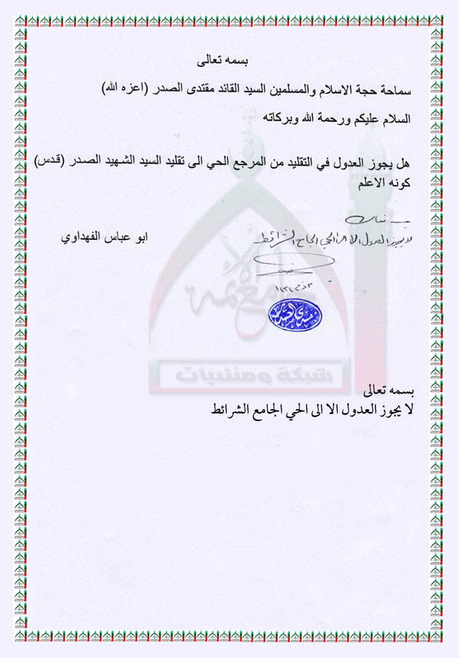 لا يجوز العدول الا الى الحي الجامع الشرائط استفتاء السيد مقتدى الصدر 9 - 10 - 2013