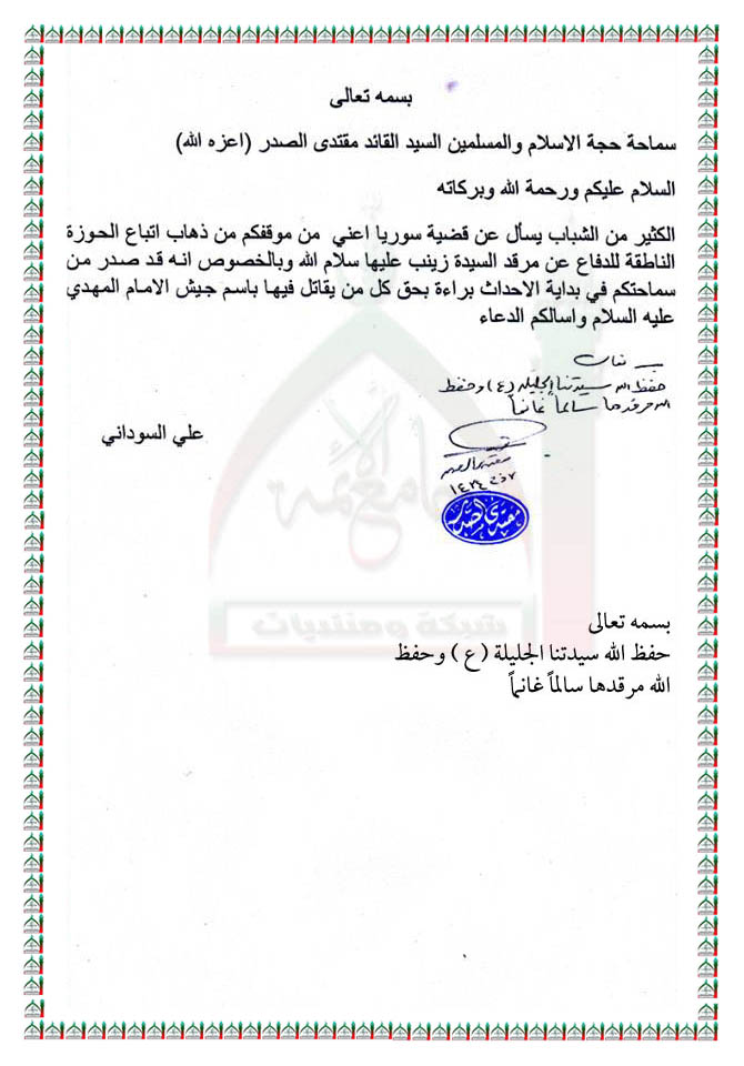 الموقف من الذهاب الى سوريا للدفاع عن مرقد السيدة زينب عليها السلام استفتاء السيد القائد مقدى الصدر اعزه الله 9 - 10 - 2013