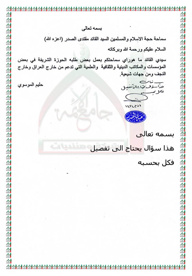 عمل طلبة الحوزة في بعض المؤسسات والمكاتب الدينية والثقافية والعلمية استفتاء السيد القائد مقتدى الصدر اعزه الله 12 - 10 - 2013