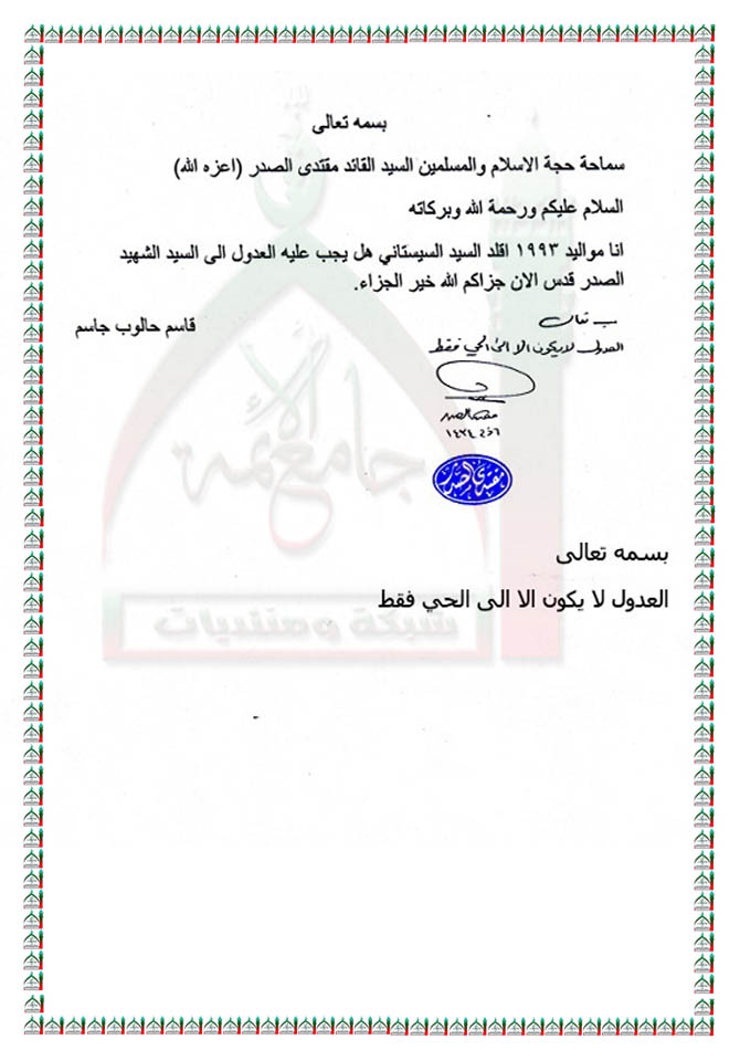 العدول في التقليد لا يكون الا الى الحي فقط استفتاء السيد القائد مقتدى الصدر اعزه الله 12 - 10 - 2013