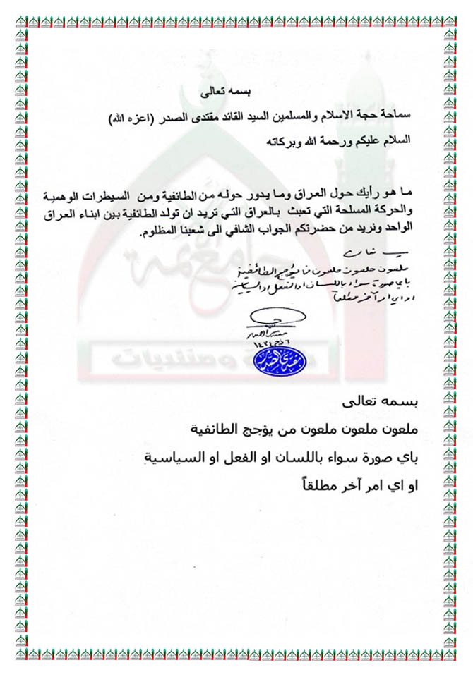 ملعون ملعون من يؤجج الطائفية بأي صورة كانت استفتاء السيد القائد مقتدى الصدر اعزه الله 12 - 10 - 2013
