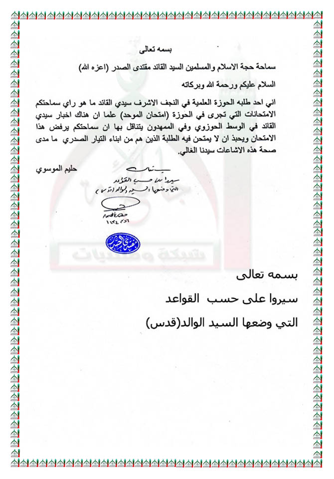قواعد الامتحان في الحوزة العلمية استفتاء السيد القائد مقتدى الصدر اعزه الله 12 - 10 - 2013