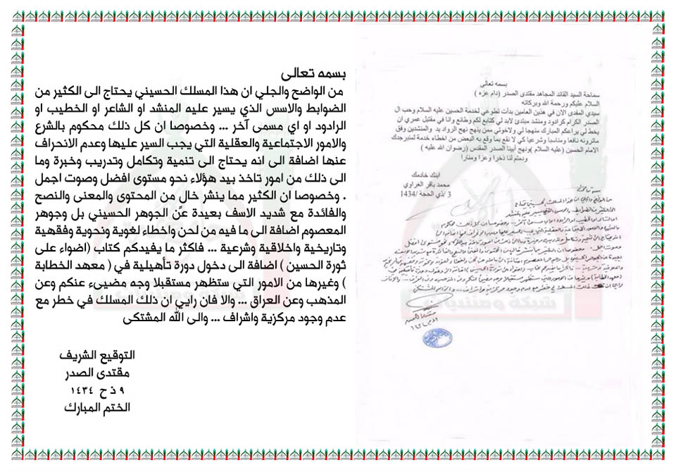 الضوابط والاسس التي يحتاجها المنشد الحسيني استفتاء السيد القائد مقتدى الصدر اعزه الله 15 - 10 - 2013