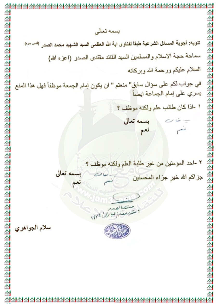 الصلاة خلف الامام الموظف استفتاء السيد القائد مقتدى الصدر اعزه الله 17 - 10 - 2013
