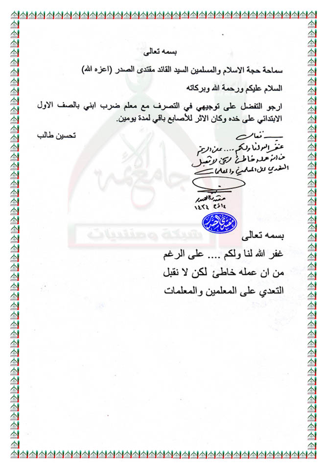 ضرب المعلمين للتلاميذ استفتاء السيد القائد مقتدى الصدر اعزه الله 20 - 10 - 2013