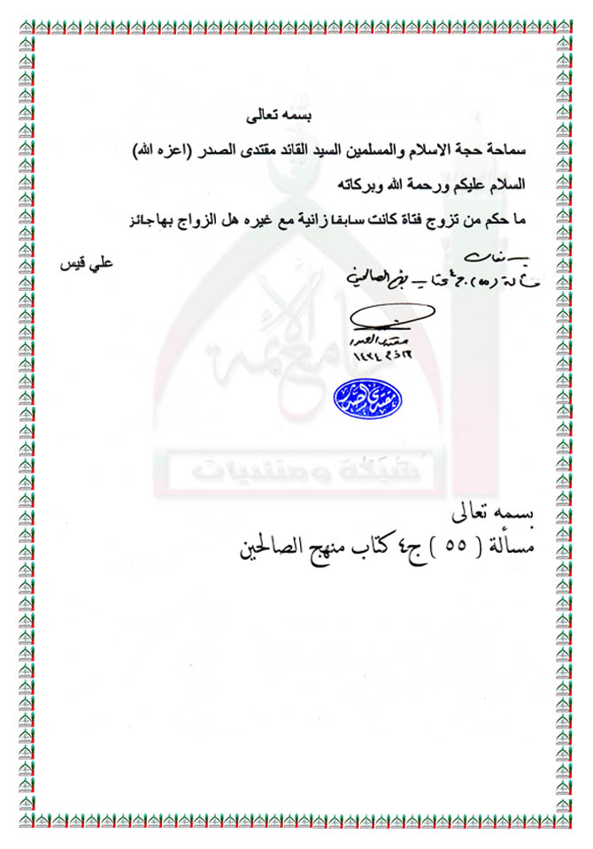 مسألة حول الزواج استفتاء السيد القائد مقتدى الصدر اعزه الله 22 - 10 - 2013
