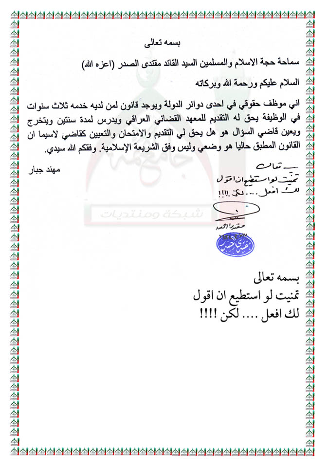 التقديم الى المعهد القضائي استفتاء السيد القائد مقتدى الصدر اعزه الله 23 - 10 - 2013