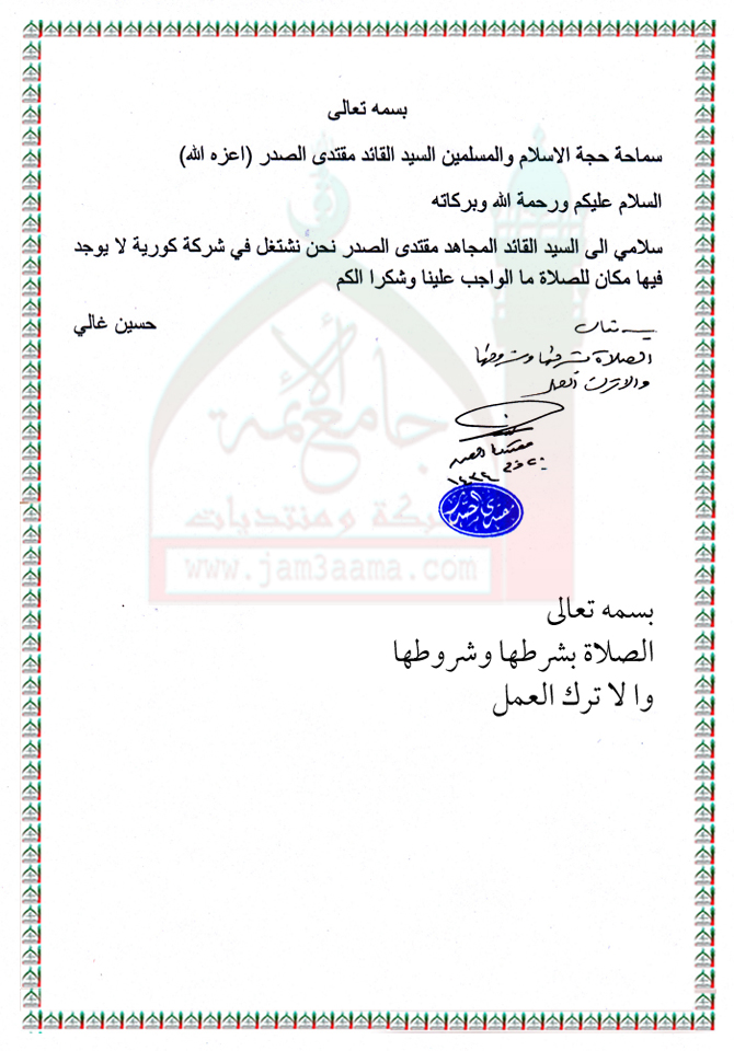 الصلاة بشرطها وشروطها استفتاء السيد القائد مقتدى الصدر اعزه الله 27 - 10 - 2013