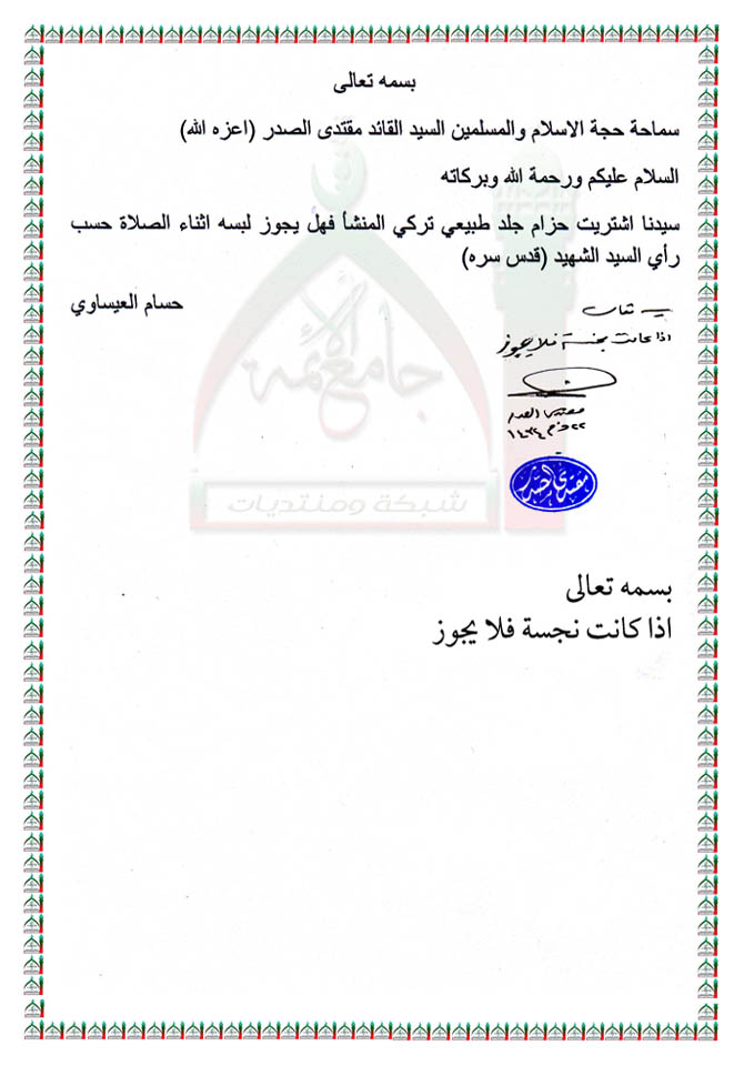 لبس الحزام المصنوع من الجلد الطبيعي في الصلاة استفتاء السيد القائد مقتدى الصدر اعزه الله 28 - 10 - 2013