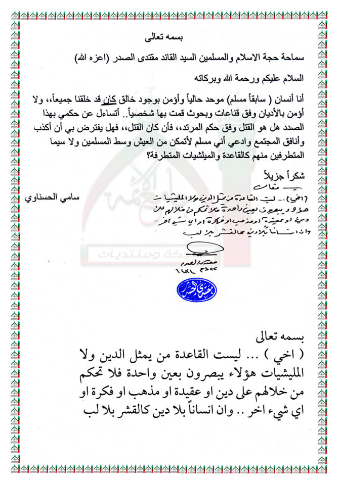 ليست القاعدة من يمثل الدين ولا المليشيات استفتاء السيد القائد مقتدى الصدر اعزه الله 28 - 10 - 2013