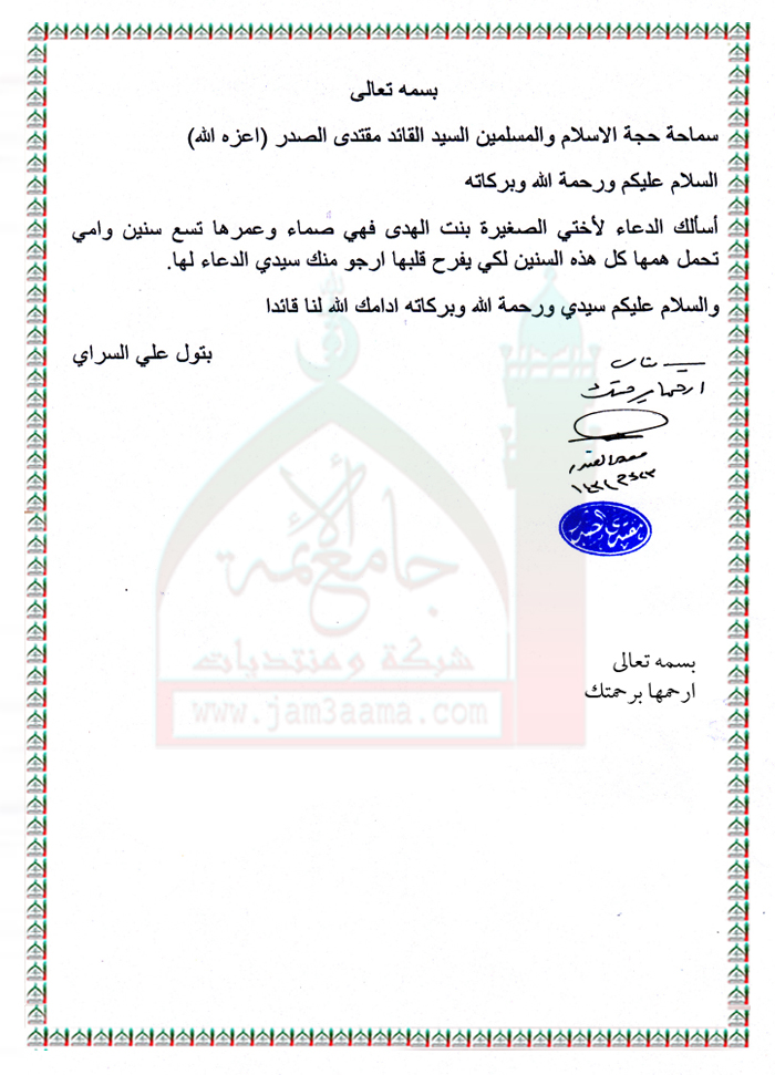 سائلة تطلب فيها الدعاء من سماحته استفتاء السيد القائد مقتدى الصدر اعزه الله 30 - 10 - 2013