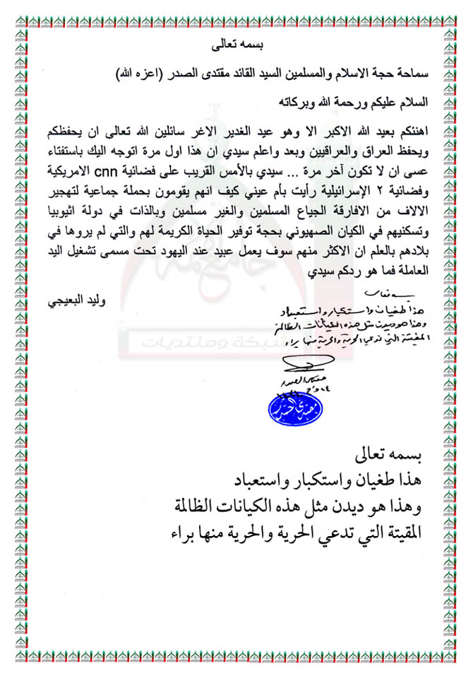 حملة تهجير الالاف من الافارقة الجياع الى الكيان الصهيوني استفتاء السيد القائد مقتدى الصدر اعزه الله 30 - 10 - 2013