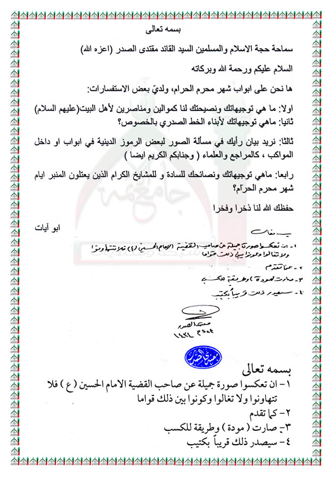 توجيهات ونصائح بمناسبة شهر محرم الحرام استفتاء السيد القائد مقتدى الصدر اعزه الله 30 - 10 - 2013