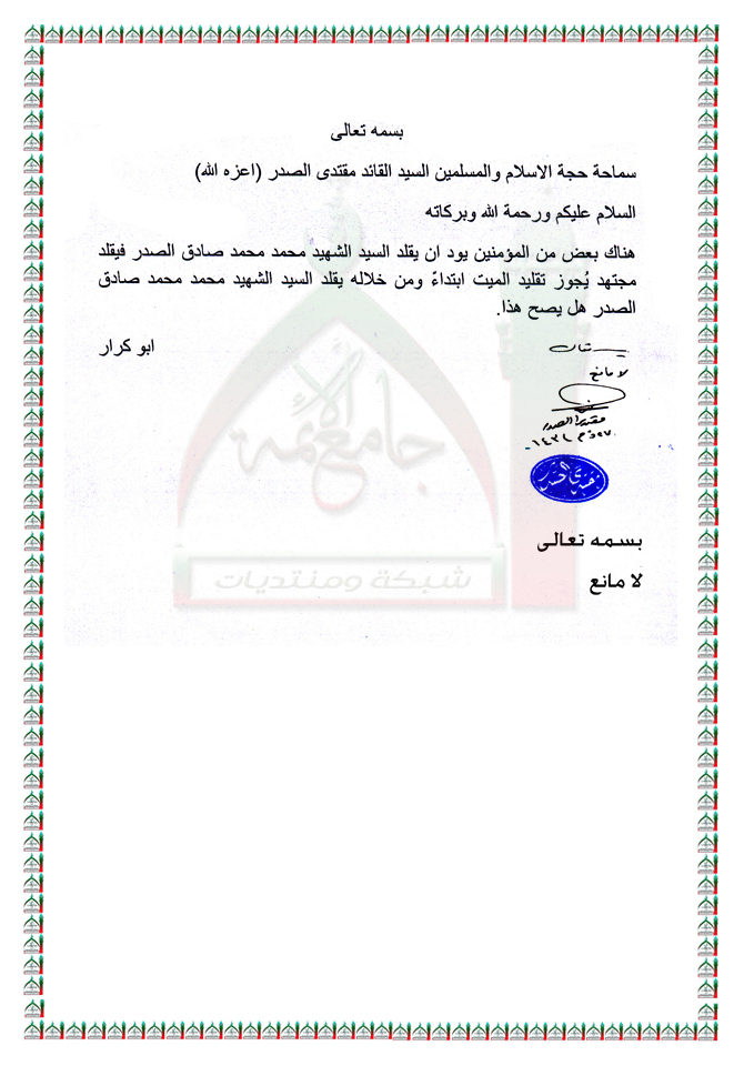 تقليد من يجوّز تقليد السيد الشهيد ابتداءا استفتاء السيد القائد مقتدى الصدر اعزه الله 2- 11 - 2013