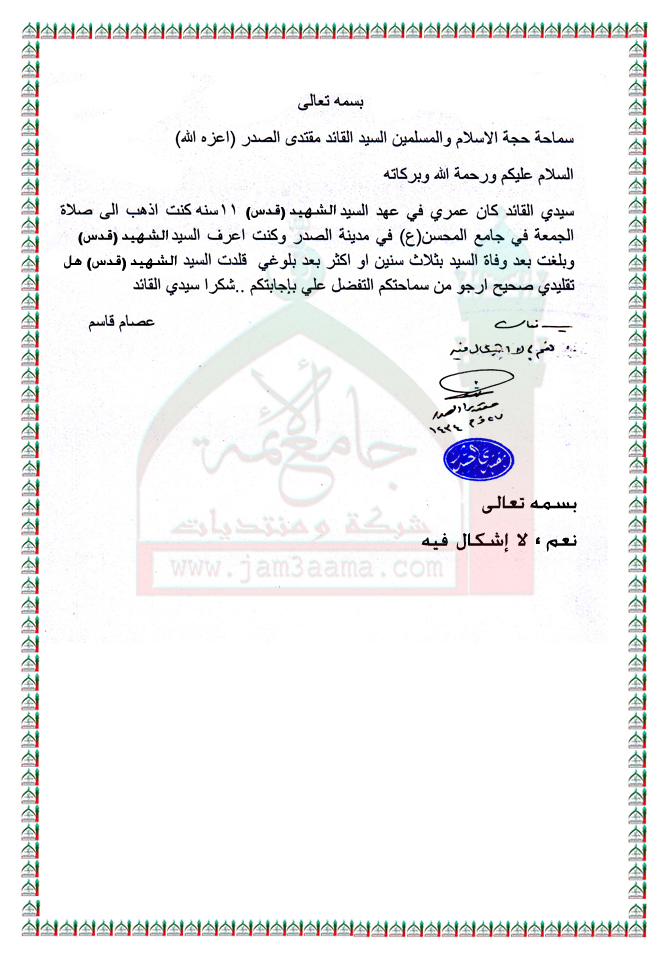 تقليد الصبي بعد بلوغه استفتاء السيد القائد مقتدى الصدر اعزه الله 2- 11 - 2013