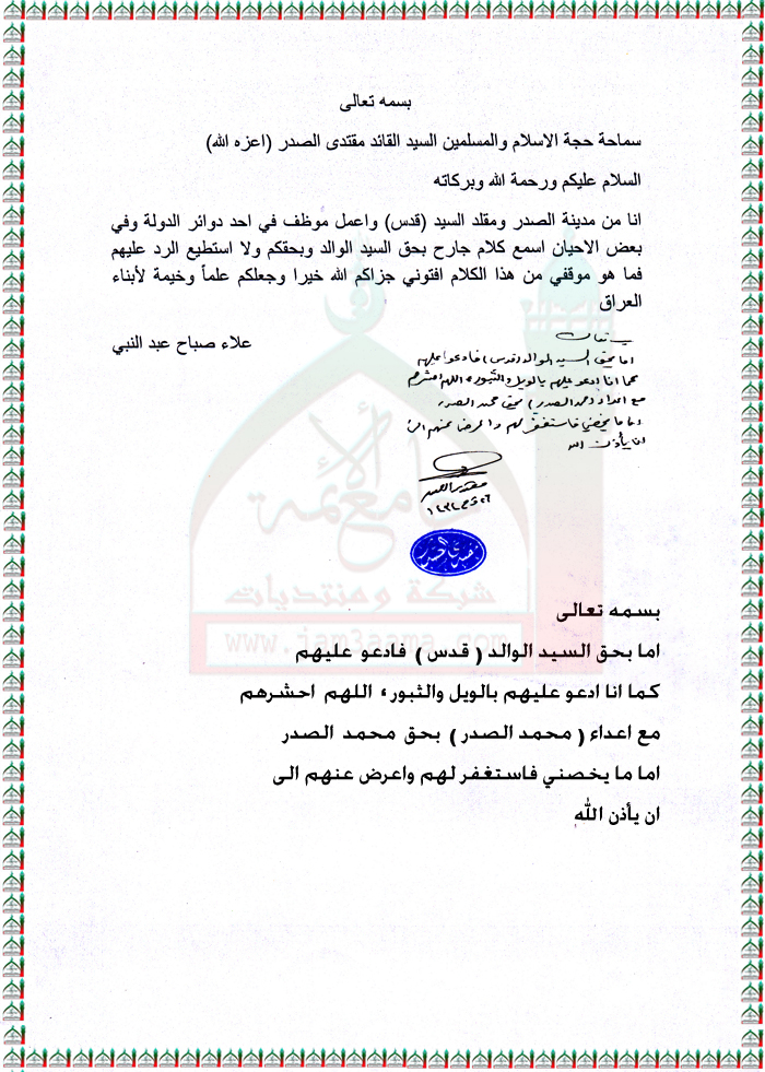 الكلام الجارح بحق السيد الشهيد (قدس سره) و السيد القائد (اعزه الله) استفتاء السيد القائد مقتدى الصدر اعزه الله 2- 11 - 2013