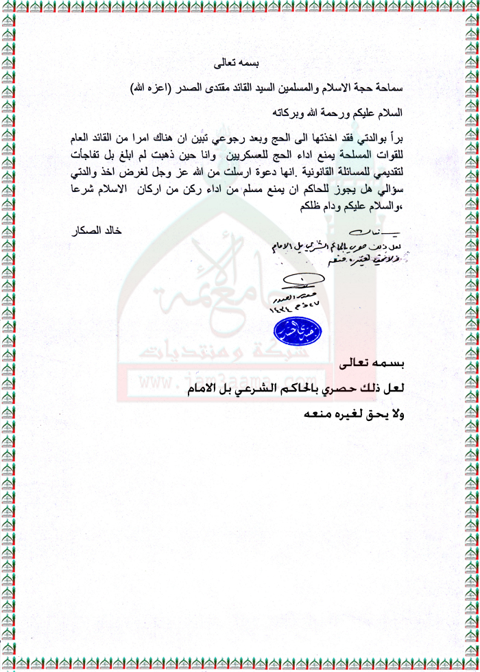 المنع من الحج استفتاء السيد القائد مقتدى الصدر اعزه الله 2- 11 - 2013