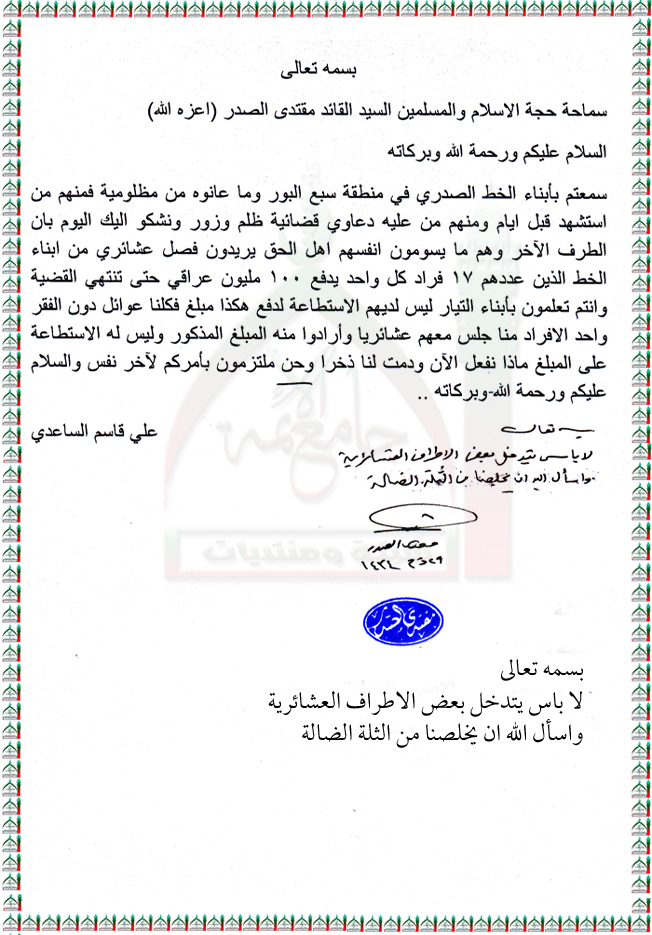 تدخل الاطراف العشائرية في حل بعض النزاعات استفتاء السيد القائد مقتدى الصدر اعزه الله 4 - 11 - 2013